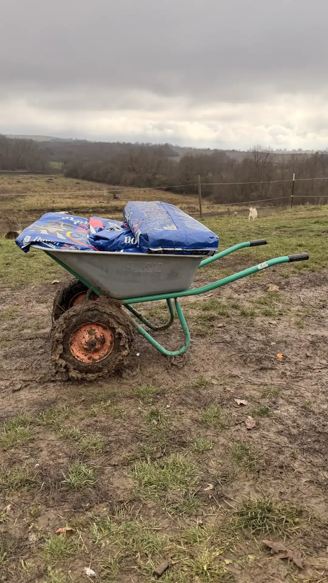 Zwei volle Schubkarrenladungen, ab durch den Matsch, und das alles mit falschen Schuhen.
