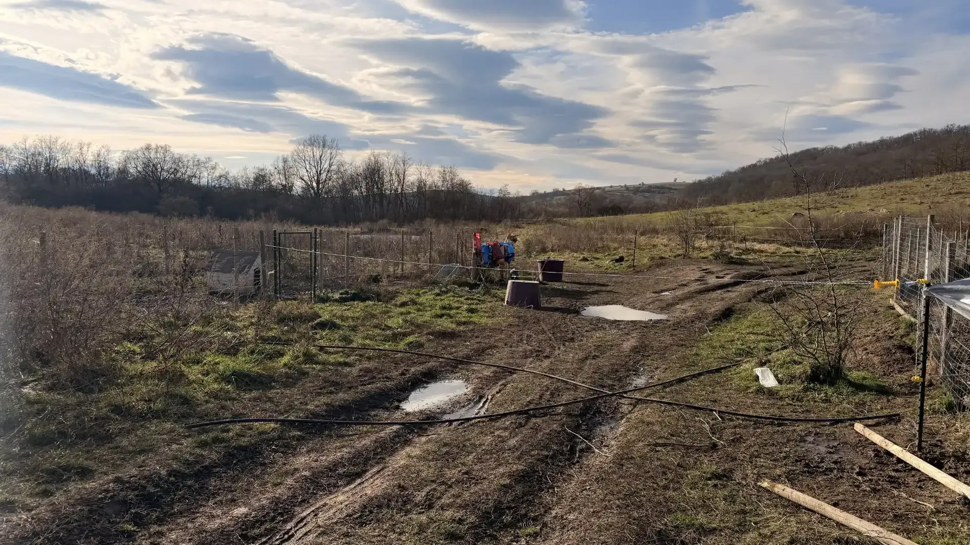 Oben angekommen begann mein Tag wie gewohnt mit dem Food Supply. Zwölf Beutel, Schubkarre durch den Matsch, ziehen, schieben – das Übliche. Danach gab es noch einen Sack Hühnerfutter, den ich in das blaue Fass bei den Hühnern gefüllt habe.