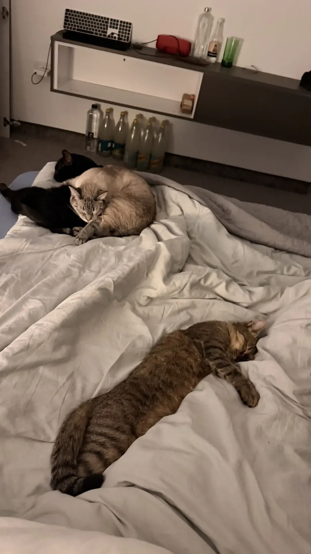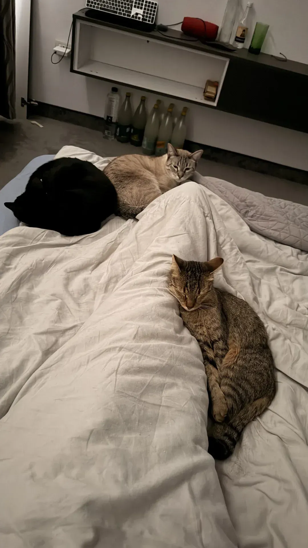 Alle Katzen waren im Apartment. Nolas musste ich kurz suchen, bis ich ihn schließlich auf einem Stuhl entdeckte, wo ich ihn zunächst übersehen hatte. Danach ging die Nacht ruhig weiter. Ich war an den Beinen regelrecht umringt: Melchior links, Nettles rechts und Babette irgendwo auf der Bettdecke. Malou und Nolas hatten im Aufenthaltsraum geschlafen.