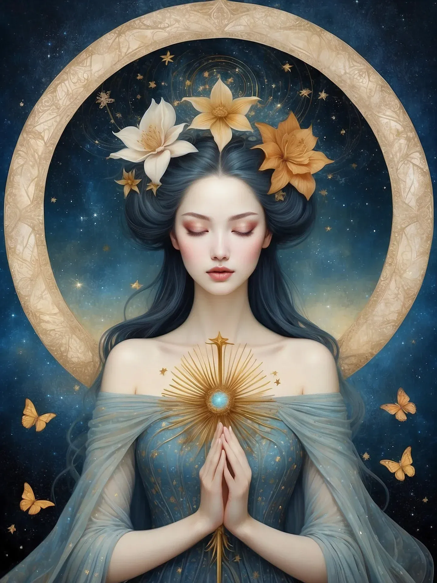 Inmitten eines samtblauen ๐ Sternenhimmels, umgeben von goldenen Spiralen โจ, still schwebenden Schmetterlingen ๐ฆ und leuchtendem Staub ๐ , ruht eine Gestalt in tiefer Stille ๐. Ihre Augen sind geschlossen – als würde sie in das hineinhorchen, was nur die Zeit erzählen kann โณ. Drei große Blüten ๐ธ๐ผ๐ชท krönen ihr Haupt – weiß, golden, bernsteinfarben – wie Boten einer inneren Jahreszeit. Ein Kreis aus Licht ๐ก umschließt sie – nicht aus Stein, nicht aus Glas, sondern aus Erinnerung ๐ญ. Man sieht eine Frau – und doch ist sie mehr als das. Sie ist die Hüterin des Feuers ๐ฅ – und sie beginnt, sich zu erinnern ๐ฎ.