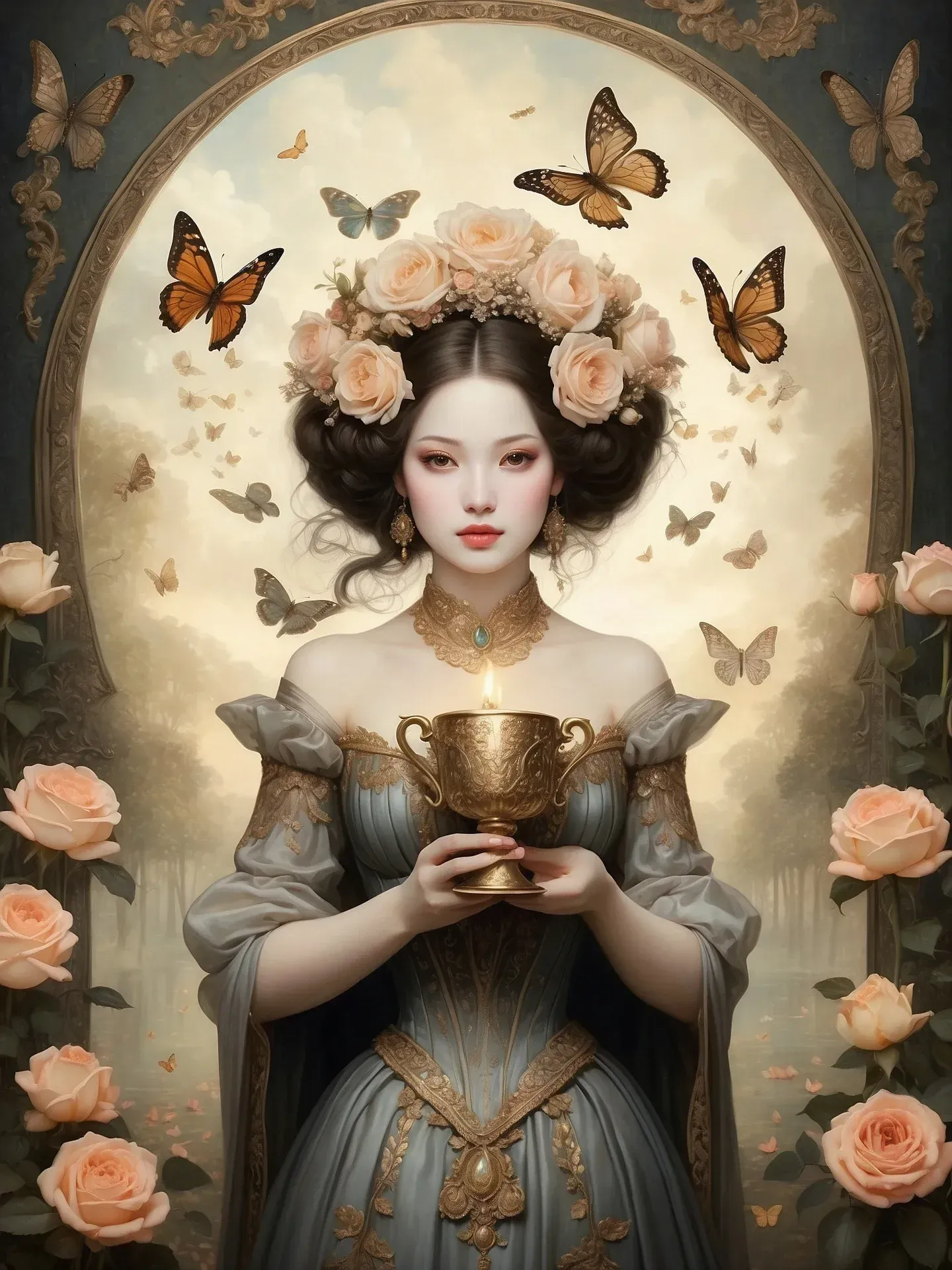 Zwischen hohen Zypressen und weichem Licht öffnet sich ein runder Raum, eingerahmt von floralen Ornamenten ๐ฟ. Schmetterlinge schweben durch die Luft ๐ฆ, als würden sie die Stille mit Bewegung umarmen. In der Mitte steht die Hüterin des Feuers, gekleidet in blaugrauen Samt mit goldenen Stickereien, das Haar geschmückt mit Rosen ๐ธ. In ihren Händen hält sie einen prunkvollen Kelch ๐ – darin tanzt eine kleine Flamme, lebendig wie ein Herz.