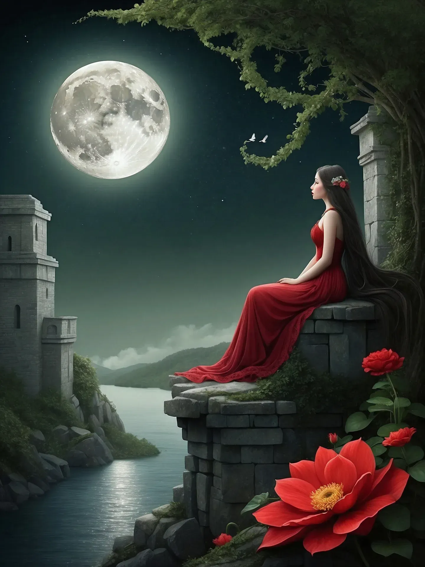 Eine alte Steinruine, umrankt von wildem Efeu ๐, unter einem weiten Nachthimmel ๐. Der Mond steht übergroß ๐ am Himmel – nah, als wolle er zuhören. Die Hüterin des Feuers sitzt auf einer steinernen Schwelle ๐ชจ, ihr rotes Haar wie ein Strom aus Erinnerungen ๐ฅ. Rosen blühen aus den Mauerritzen ๐น, als ob selbst der Stein sich noch erinnert. Hier spricht nichts. Aber alles meint sie.