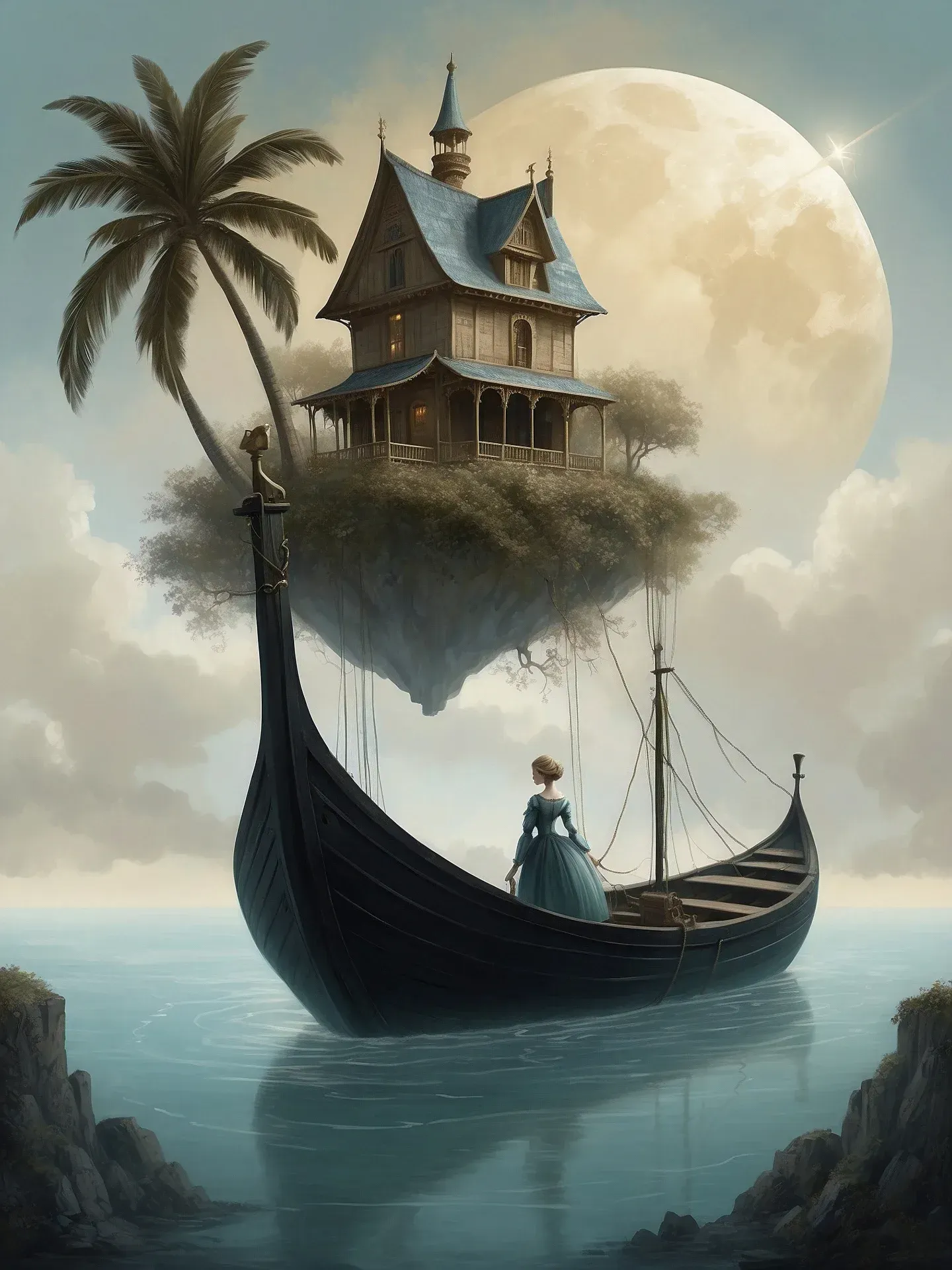 Ein stilles Meer schimmert wie flüssiger Spiegel ๐. Darauf gleitet ein dunkles Langboot ๐ค – schlank wie ein Federkiel – getragen von kaum wahrnehmbaren Wellen. Am Bug steht die Hüterin des Feuers ๐ฅ: ihr Kleid smaragdgrün, ihr Blick weit. Vor ihr schwebt eine kleine Insel – mit einem hölzernen Haus ๐ , Palmenkrone ๐ด und Wurzeln aus Nebel. Hinter allem steigt ein weiß-goldener Vollmond ๐ empor; ein Lichtstrahl trifft das Dachfirst wie ein Komet โจ. Der ganze Himmel riecht nach Aufbruch.
