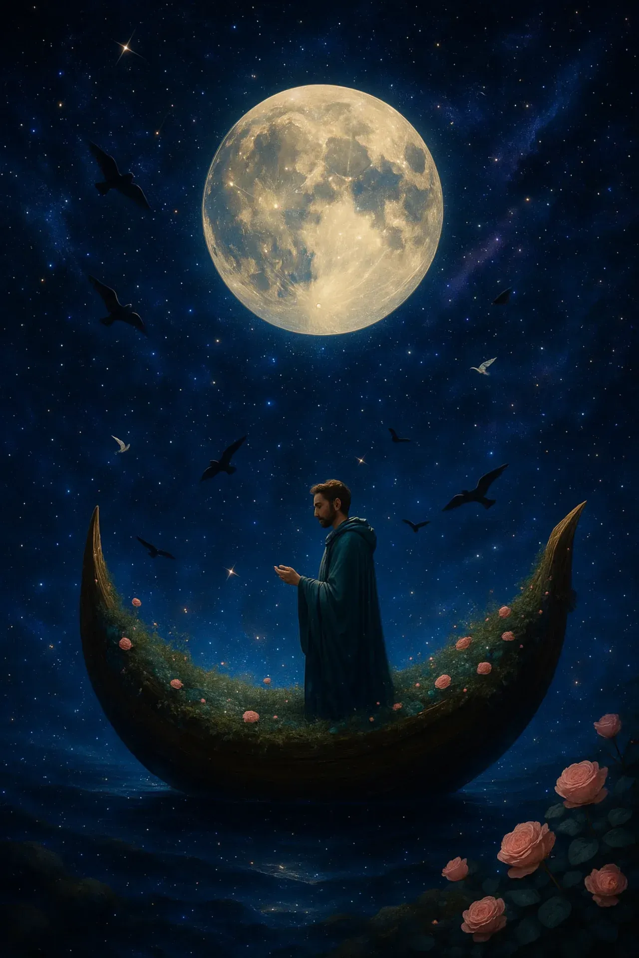 Inmitten eines ozeanischen Himmels, dort wo die Sterne wie flüsternde Wesen über das Schwarze segeln, gleitet ein Boot aus Holz und Rosenblüten lautlos durch die Nacht. Die Wasseroberfläche darunter – ein samtiger Spiegel, kaum bewegt. Kein Wind. Kein Rufen. Nur das silberne Licht des gewaltigen Mondes, das alles durchdringt.