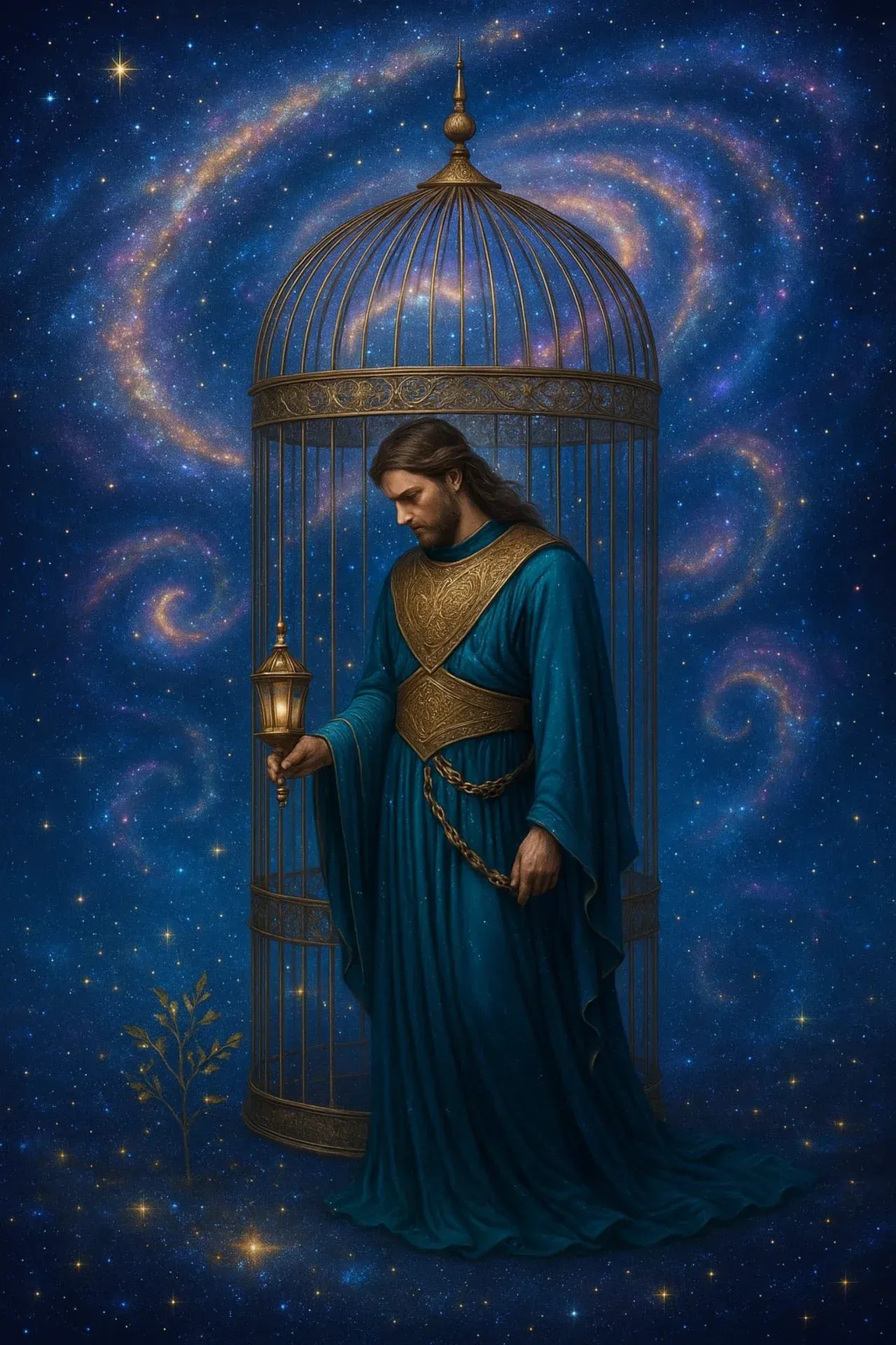 Er hebt die Laterne. Kein Wind bewegt sich. Doch das Licht reicht aus, um einen ersten Schritt zu erkennen: einen Weg aus Lichtstaub, der sich durch das Sternenfeld zieht, hinaus aus dem Käfig, hinein in das Unbekannte.