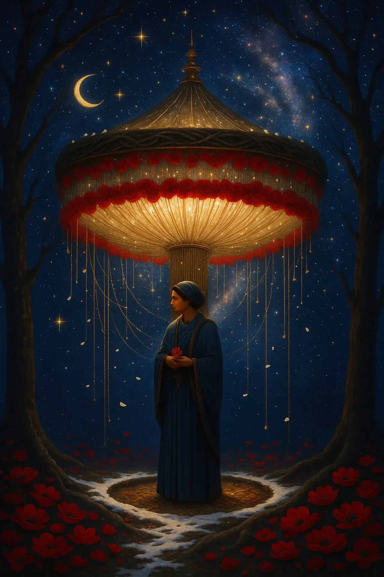 Zwischen zwei uralten Bäumen, deren Äste sich in die galaktische Tiefe strecken, steht Somar im Kreis aus Licht. Über ihm schwebt ein prachtvoller Baldachin aus goldgewirktem Stoff, geschmückt mit roten Rosen und feinen Fäden, die wie Erinnerungsfäden von der Kuppel hängen. Der Sternenhimmel darüber atmet leise.
