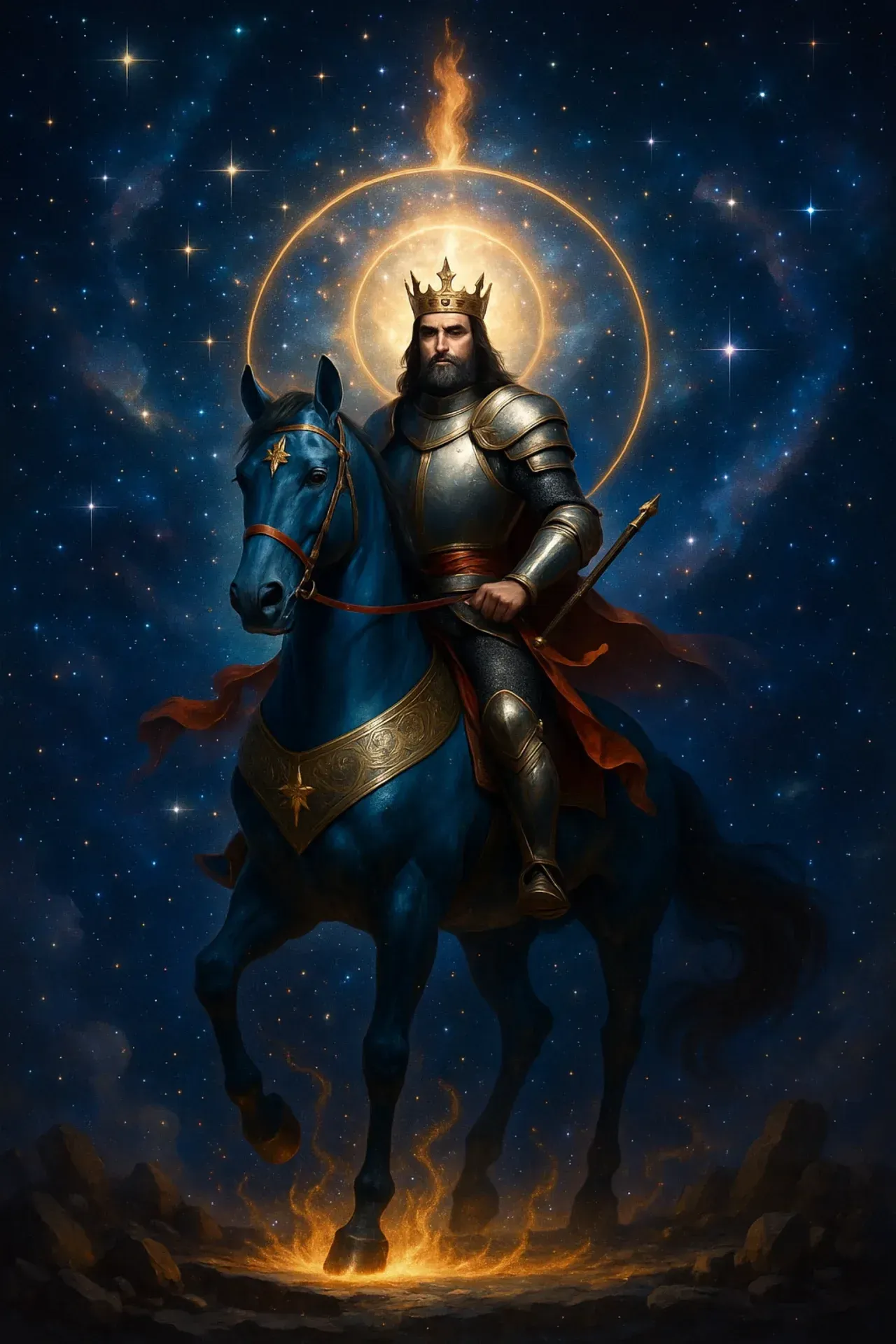 Das Pferd ist Kraft und Richtung – Instinkt und Rhythmus. Die goldene Krone über Somars Haupt ist nicht Macht, sondern Erkenntnis. Die Rüstung schützt nicht, sie leuchtet. Und der brennende Kreis hinter ihm? Es ist das Siegel seiner Rückkehr ins Bewusstsein: Ein innerer Sonnenaufgang, aus Sternen geboren.