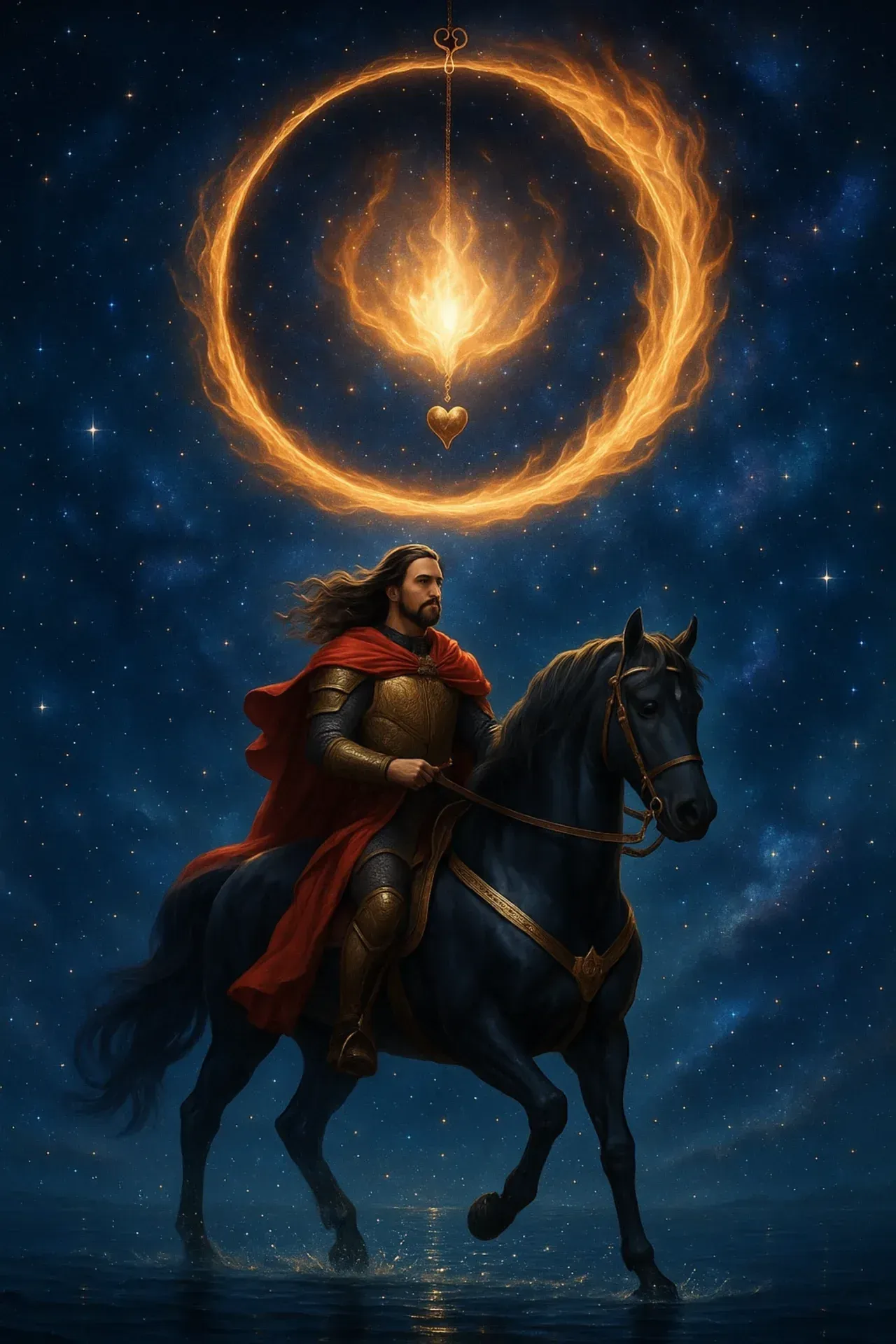 Über ihm schwebt ein flammender Kreis aus goldenem Licht – darin ein brennendes Herz, gehalten von einem goldenen Schlüssel. Kein Laut ist zu hören, nur das rhythmische Schlagen der Hufe im Wasser – wie der Takt einer Entscheidung, die nicht länger aufgeschoben wird.