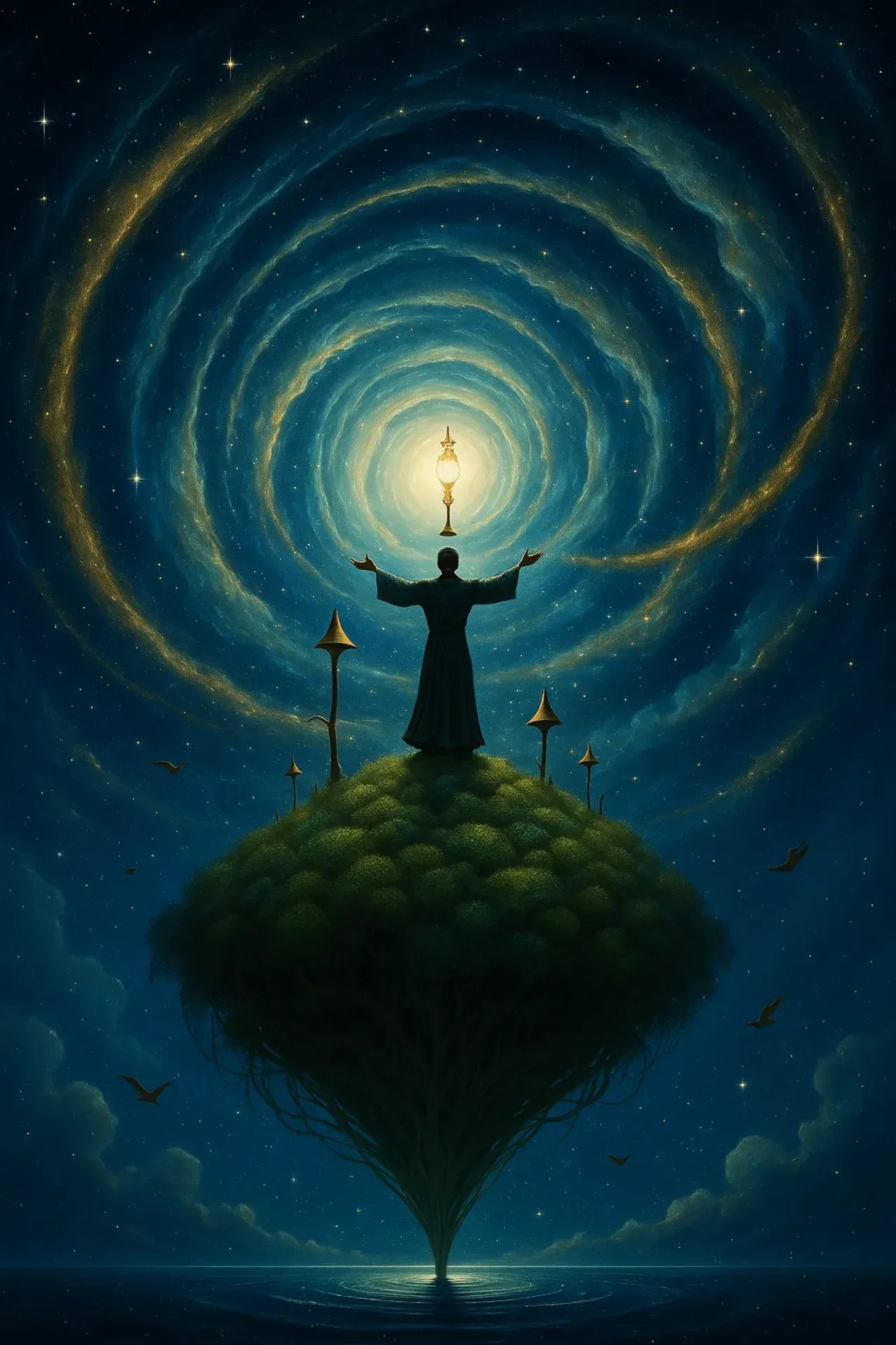 Die Insel ist Sein – verwurzelt im Unbewussten, getragen vom Wasser des Fühlens. Die Spirale ist Bewegung in Erkenntnis. Die Laterne ist das höhere Selbst – wartend, leuchtend, liebevoll. Somars Geste ist ein altes Zeichen: Empfang statt Kontrolle.