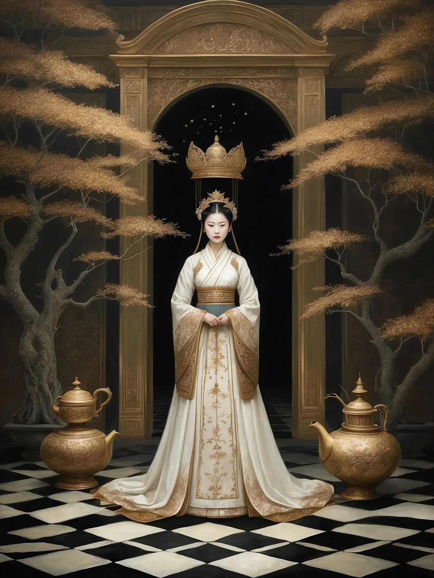 Die Halle ist still. Goldene Bäume wiegen sich in einem unsichtbaren Wind ๐, auf schwarz-weißen Fliesen liegt der Abdruck vieler Schritte – doch keiner stört den Moment.