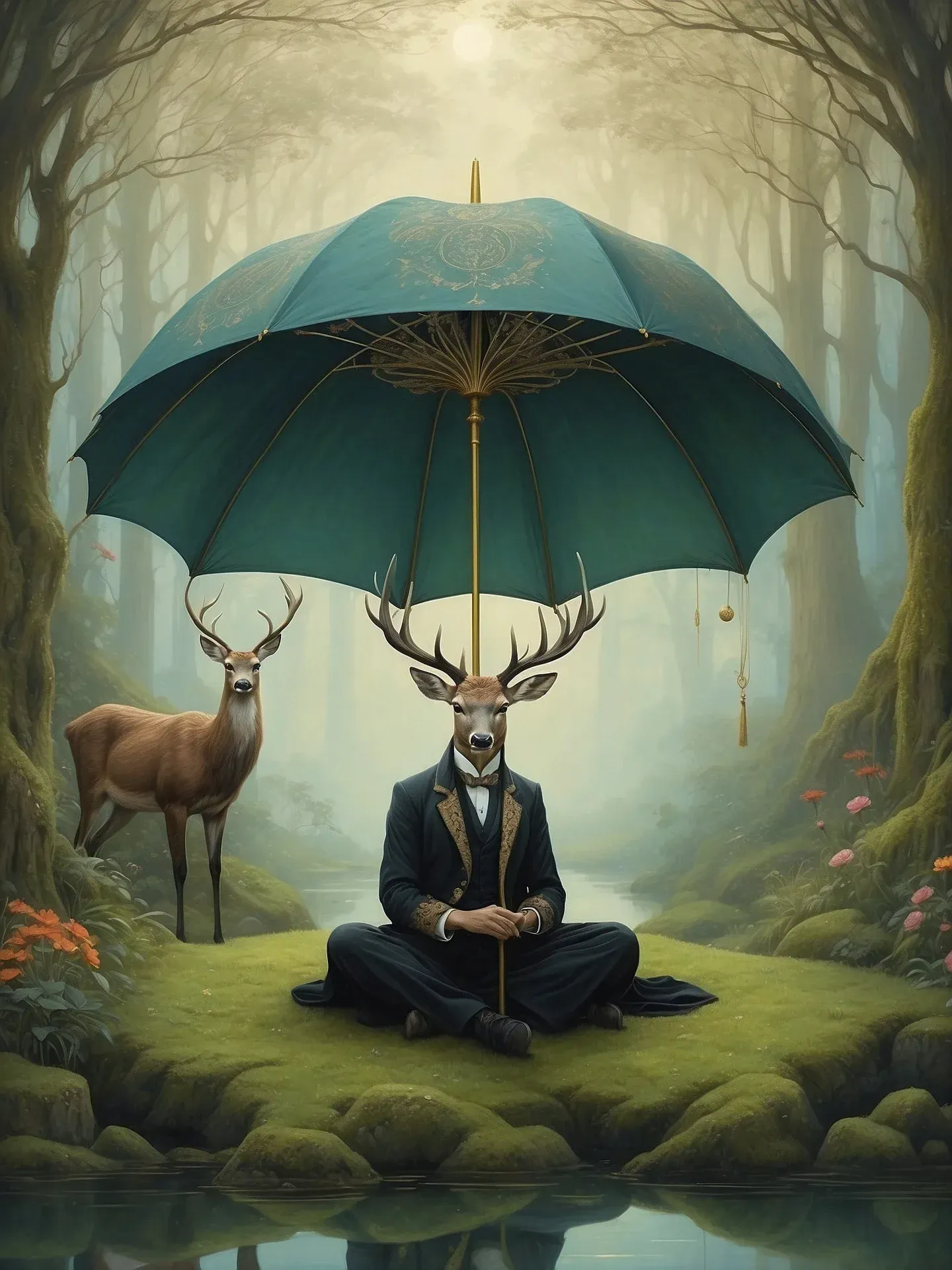 Inmitten dieses moosweichen Ortes ๐ sitzt der Geweihträger – ein Wesen mit menschlicher Haltung und dem Haupt eines Hirsches ๐ฆ. Unter einem kunstvoll geschmückten Schirm โ๏ธ, aufrecht, ruhig, gelassen. Seine Hände ruhen um einen goldenen Stab ๐ช, der wie ein Zeiger im Uhrwerk der Welt wirkt.