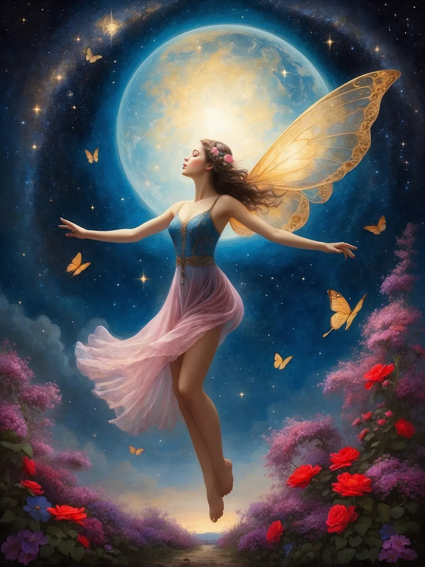 Die Luft ist voll von Lichtstaub โจ. Zwischen Rosen ๐น und Lavendelbüscheln erhebt sich eine Lichtung, die keiner Jahreszeit gehört. Der Himmel über ihr ist tiefblau, durchzogen von goldenen Adern wie von Erinnerung. Und mittendrin: der Mond ๐, groß, schwebend – ein stiller Zeuge.