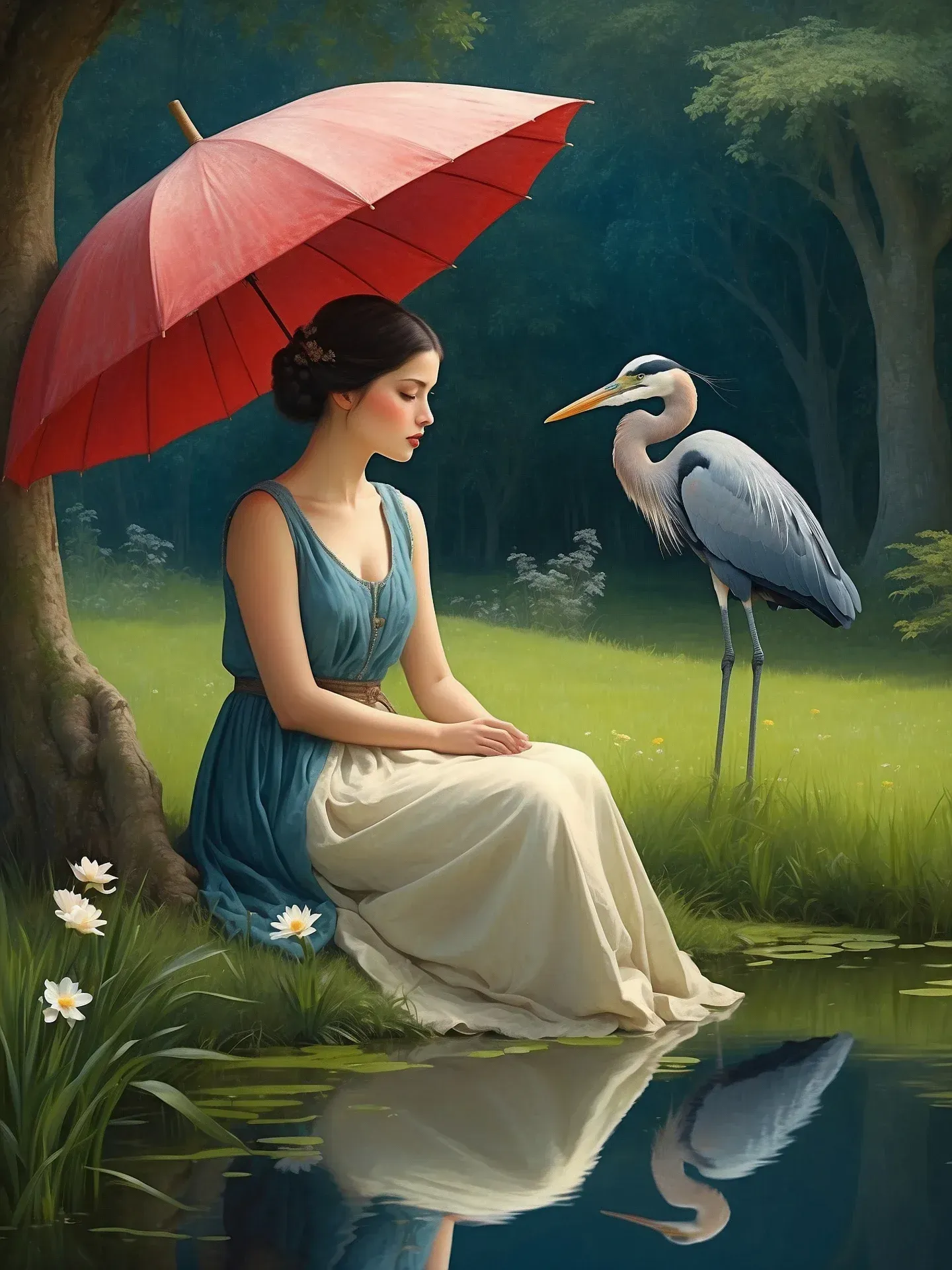 Ein See, so glatt wie Erinnerung. Kaum ein Laut, nur das Summen des Lichts zwischen den Grashalmen ๐พ. Unter einem roten Schirm โ๏ธ sitzt die Zeitenträgerin – schweigend, versunken, in sanfter Erwartung.