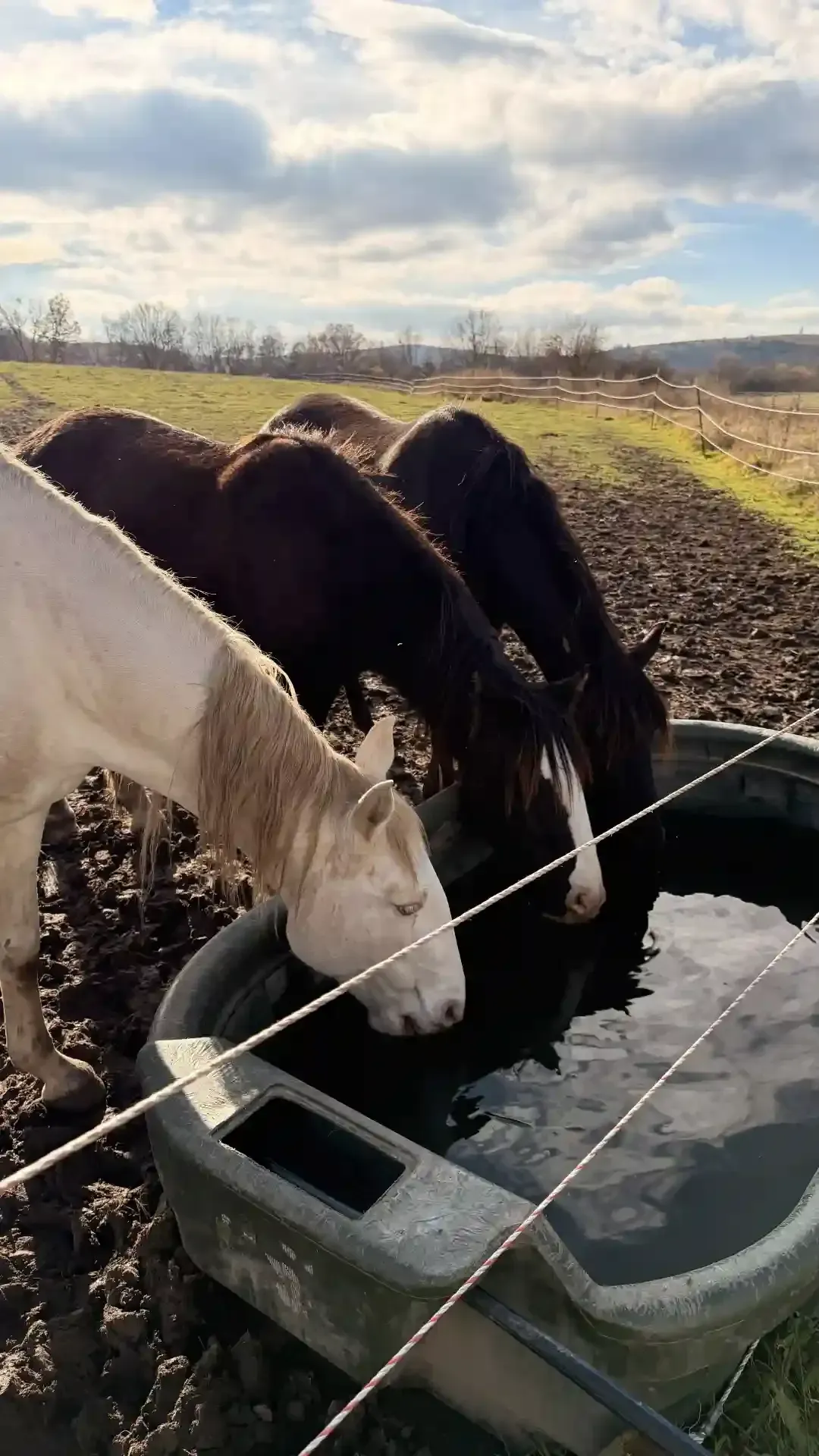 Oben angekommen entleerten wir die Fässer in die Pferdetränke und starteten direkt in die nächste Runde. Auf den Fotos seht ihr, wie die ersten Pferde neugierig herangetrabt kamen – mit gespitzten Ohren und funkelnden Augen – und sich über das kühle Nass freuten. Drei Touren haben wir heute geschafft. Das hat insgesamt gut funktioniert, auch wenn die Fässer nicht ganz dicht sind und die Fahrt für den Duster so zu einer etwas feuchten Angelegenheit wurde. ๐ฆ