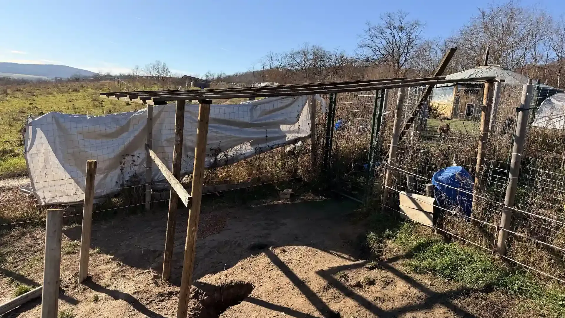 Aus alten Holzpfosten und Latten habe ich dann eine neue Überdachung gebaut – diesmal richtig stabil, nicht nur gespannt, sondern ein kleines Dachkonstrukt. Wenn wir demnächst noch die eingerissene Plane austauschen, haben die Hunde es dort endlich komplett trocken. Für den Moment habe ich die Plane überlappend fixiert, sodass es erstmal hält.