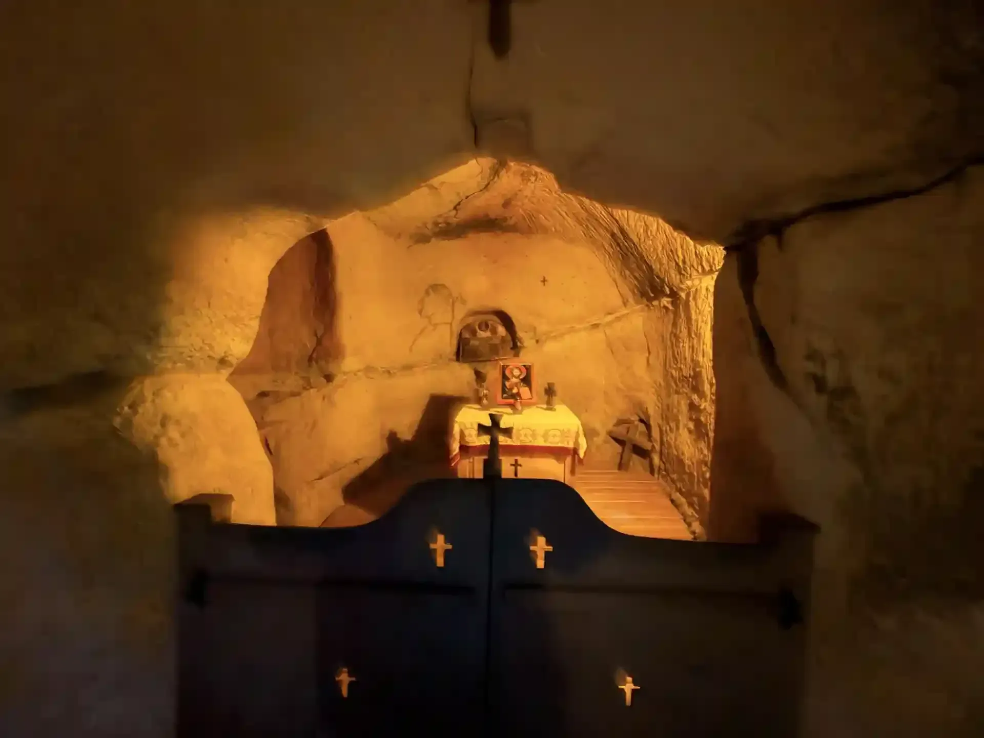 Als die Schüler schließlich oben ankamen, gingen wir hinunter und betraten die Höhle. Ich spürte sofort, dass dieser Ort sehr alt ist – vermutlich älter als das Kloster selbst. Für mich fühlte er sich eher wie eine Beobachtungsstätte oder ein Energiezentrum an. Das Loch in der Decke erinnerte mich an ein Observatorium, durch das man Sterne und Licht sehen kann. Die Wände trugen ein Fischgrätenmuster, das für mich nicht von Hand zu stammen schien. Der Hauptgang führte in die Tiefe, rechts und links zweigten weitere Kammern ab, die aber verschlossen waren. Am Ende ging es nach rechts in eine kleine Kammer, in der die Nonnen einen orthodoxen Altar errichtet hatten.