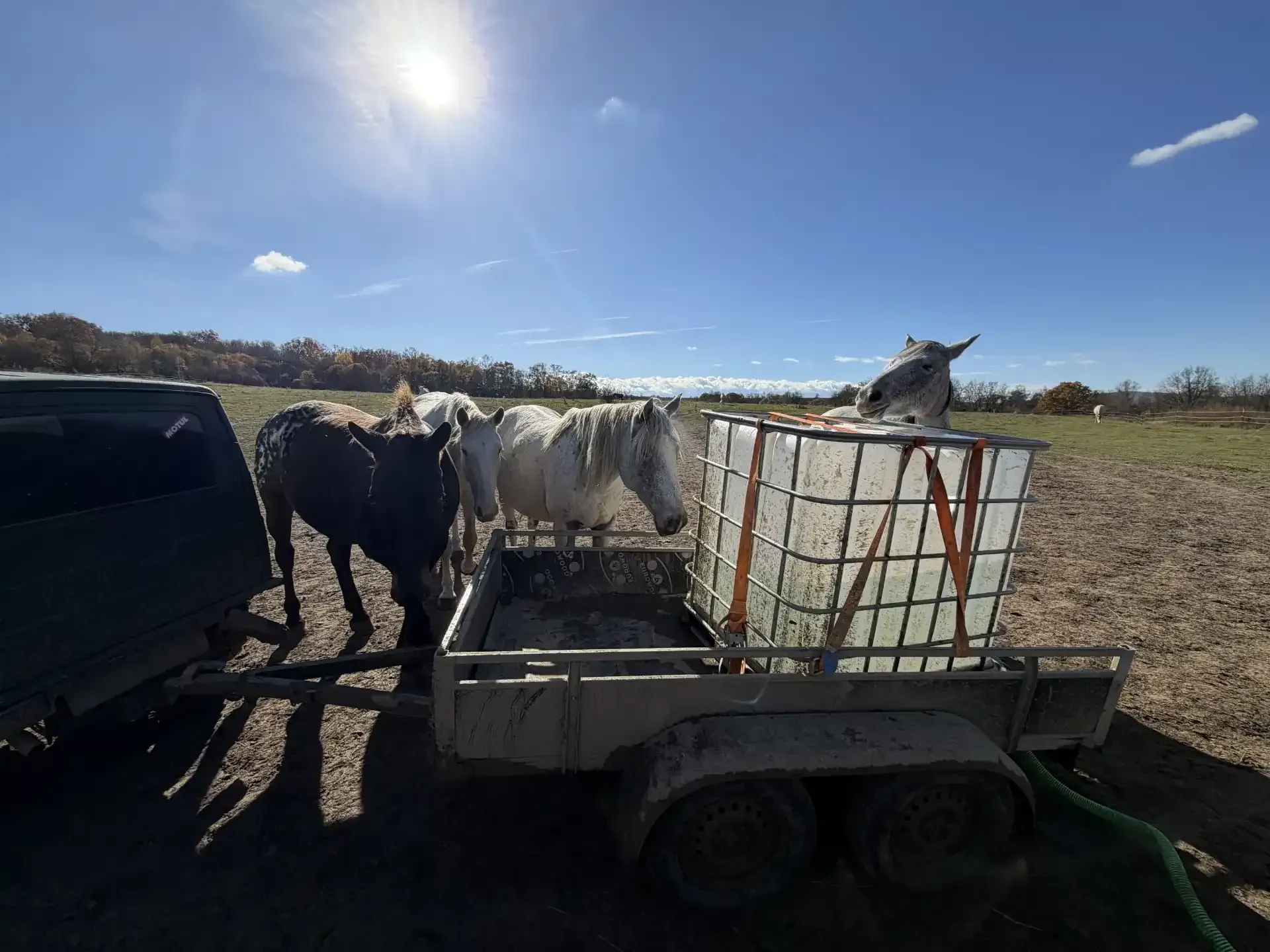 Ich habe diesmal versucht, den normalen Eingang hochzufahren, aber mit dem Gewicht im Hänger kam ich den kleinen Hügel nicht hoch. Nach drei Versuchen gab ich auf und nahm den Umweg über die Hengstwiese. Oben stellte ich den Samurai mit dem Wasser vor der Koppel der Ladys ab, damit Teo später selbst befüllen konnte. In den zwei bis drei Stunden, in denen ich unterwegs war, hatten sie sage und schreibe 900 Liter Wasser getrunken – das hat mich echt überrascht.