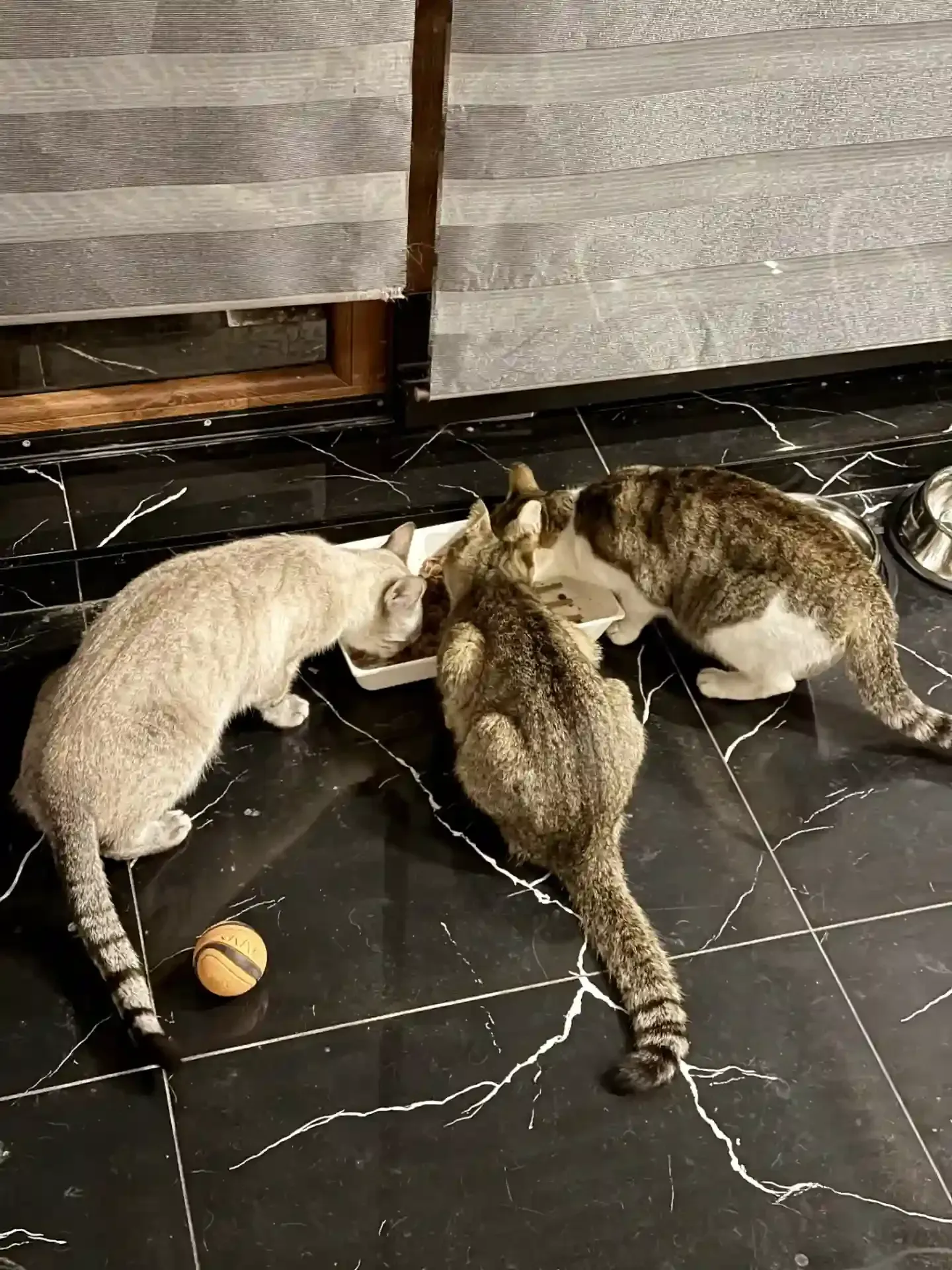 Auf einem Foto sieht man Melchior, wie er sich ganz selbstverständlich an der Futterschale der Mutterkatze bedient, während auf dem anderen Bild Nolas, Nettles und die Mutterkatze brav gemeinsam aus einer Schale fressen. ๐Ÿˆ๐Ÿพ