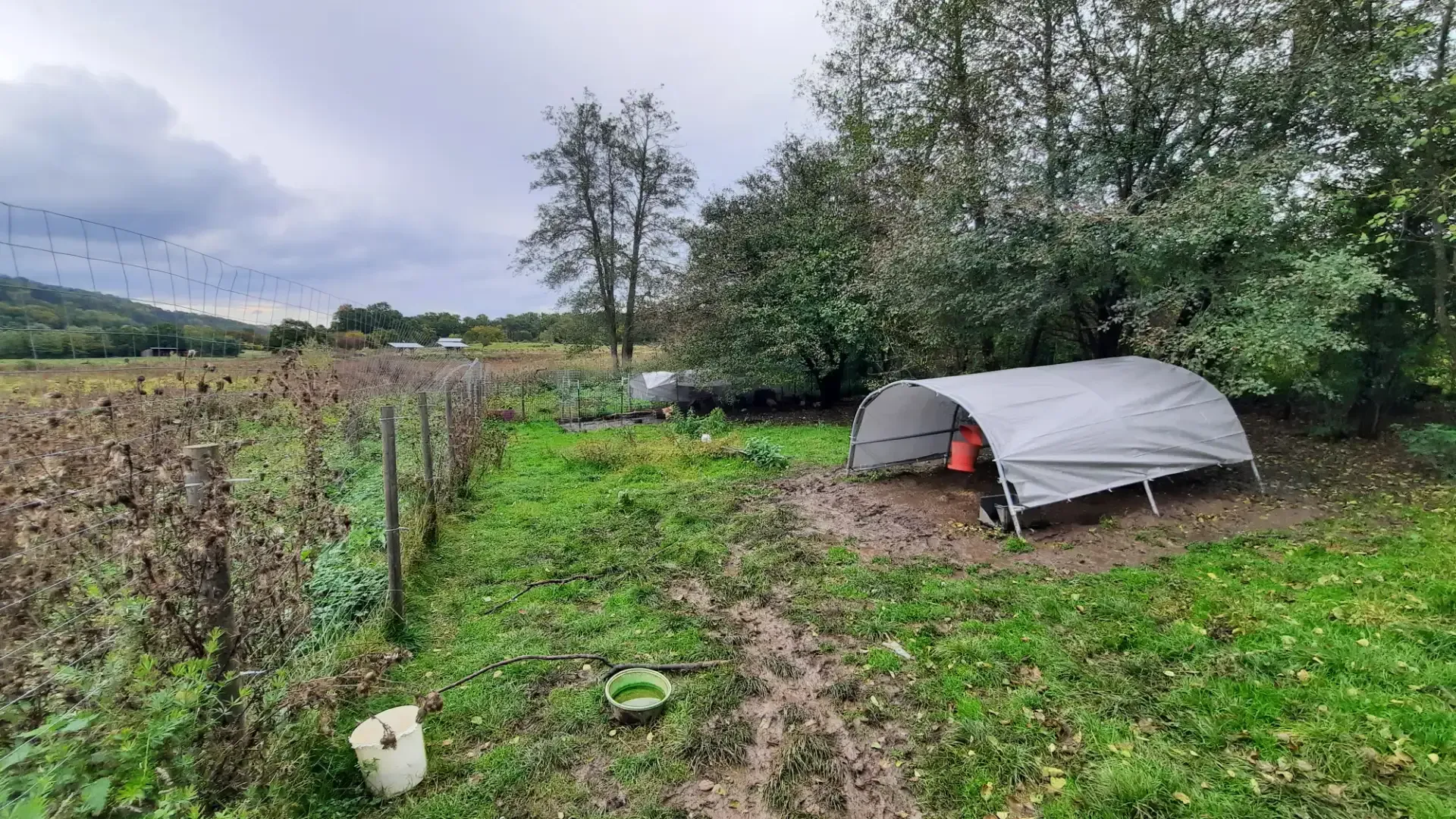 ๐Ÿ›  Anschließend haben wir im Gehege der Hähne den Tunnel erneuert: Eine frische Plane sorgt jetzt wieder für trockenen Unterschlupf bei Regen. Für den Winter ist ein richtiger Hühnerstall in Planung.